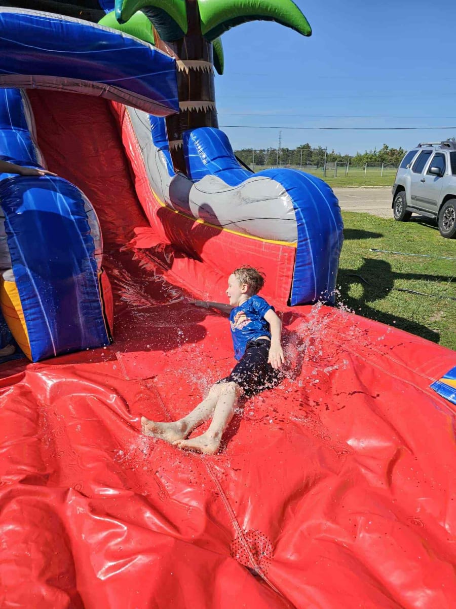 The slide measures 32 feet in length, 11 feet in width, and towers at 18 feet high. We provide all the essentials, including a tarp and an extension cord (50-100 feet), so you can focus on having fun! Just make sure you have a water source and a water hose that reaches the setup area, along with an electric outlet within 50-100 feet.